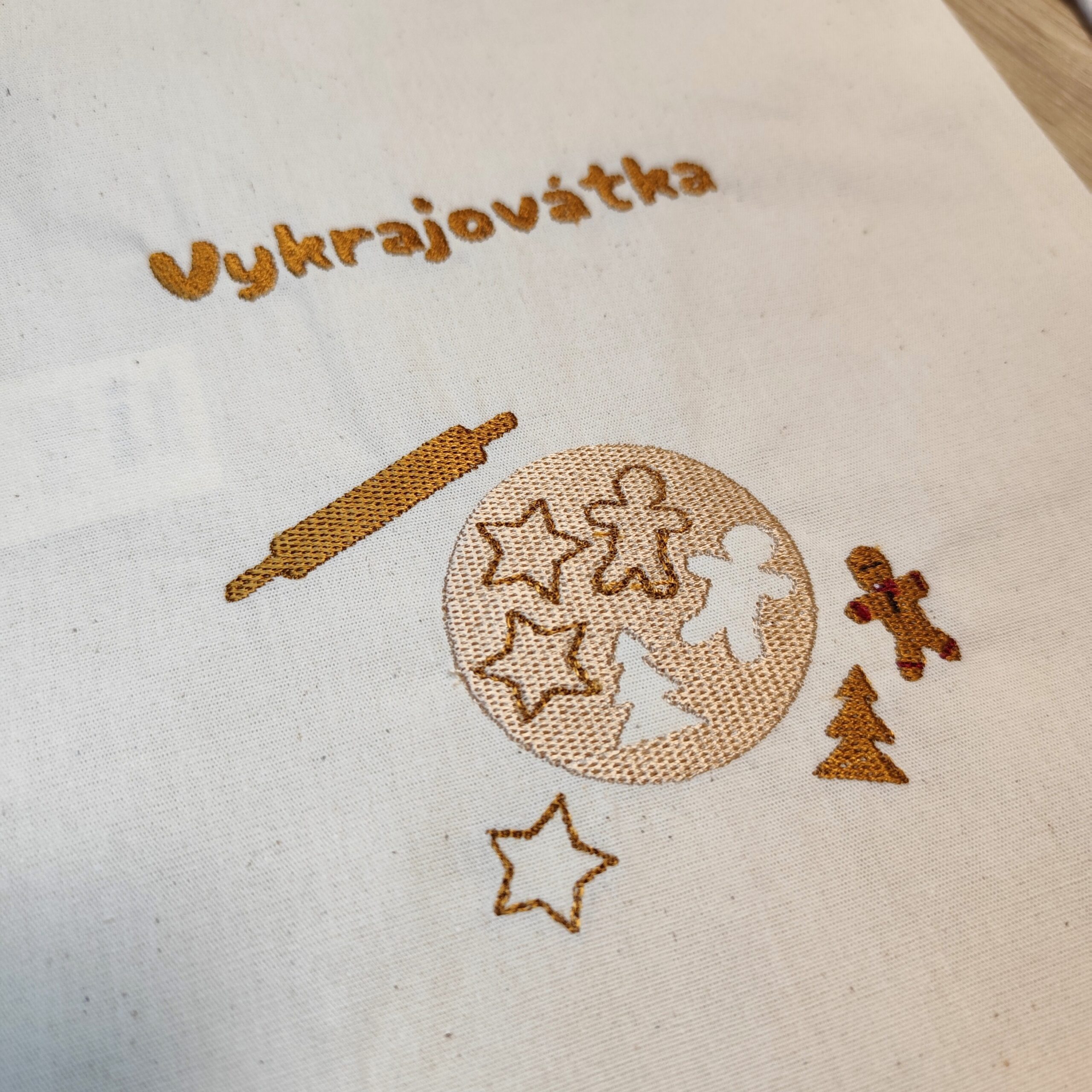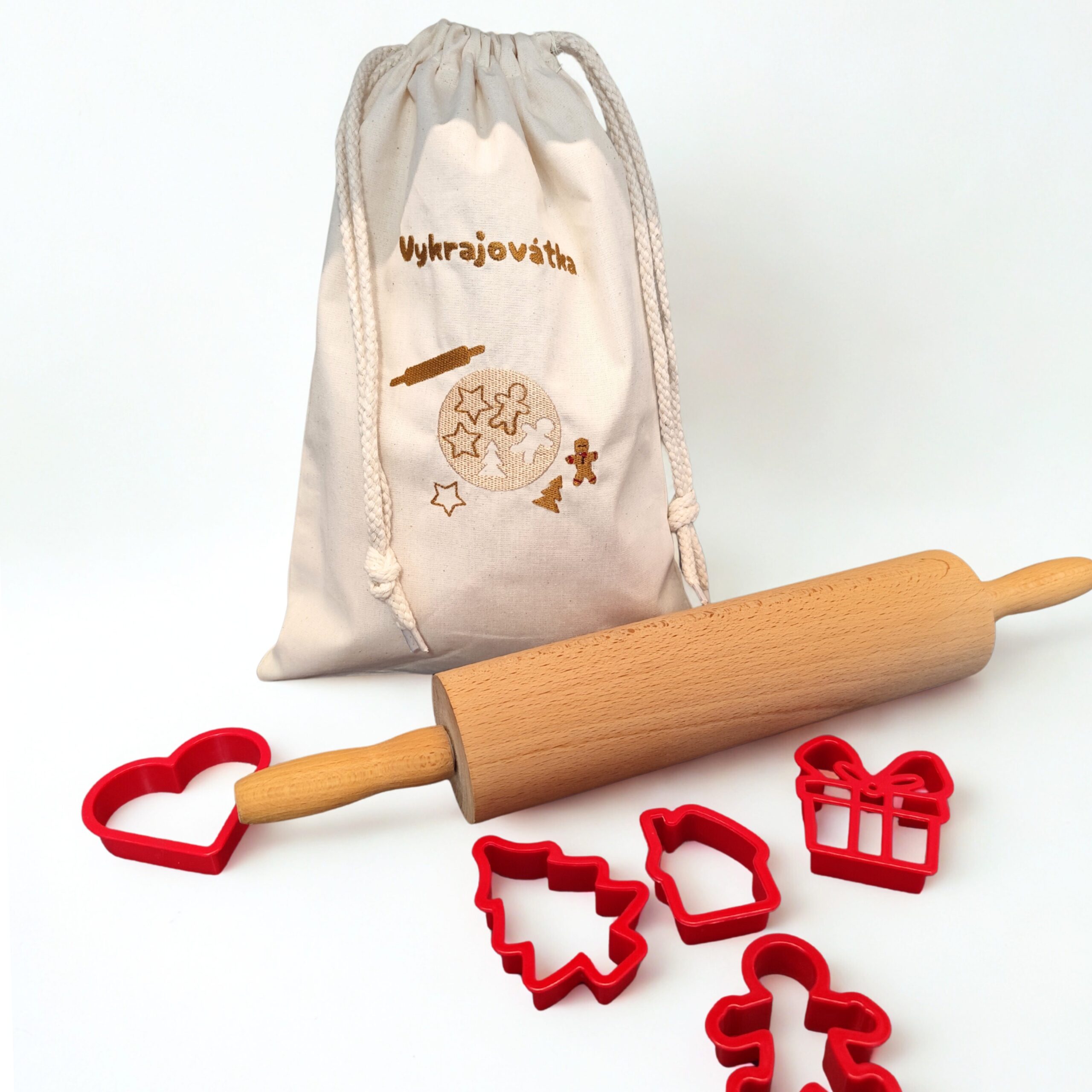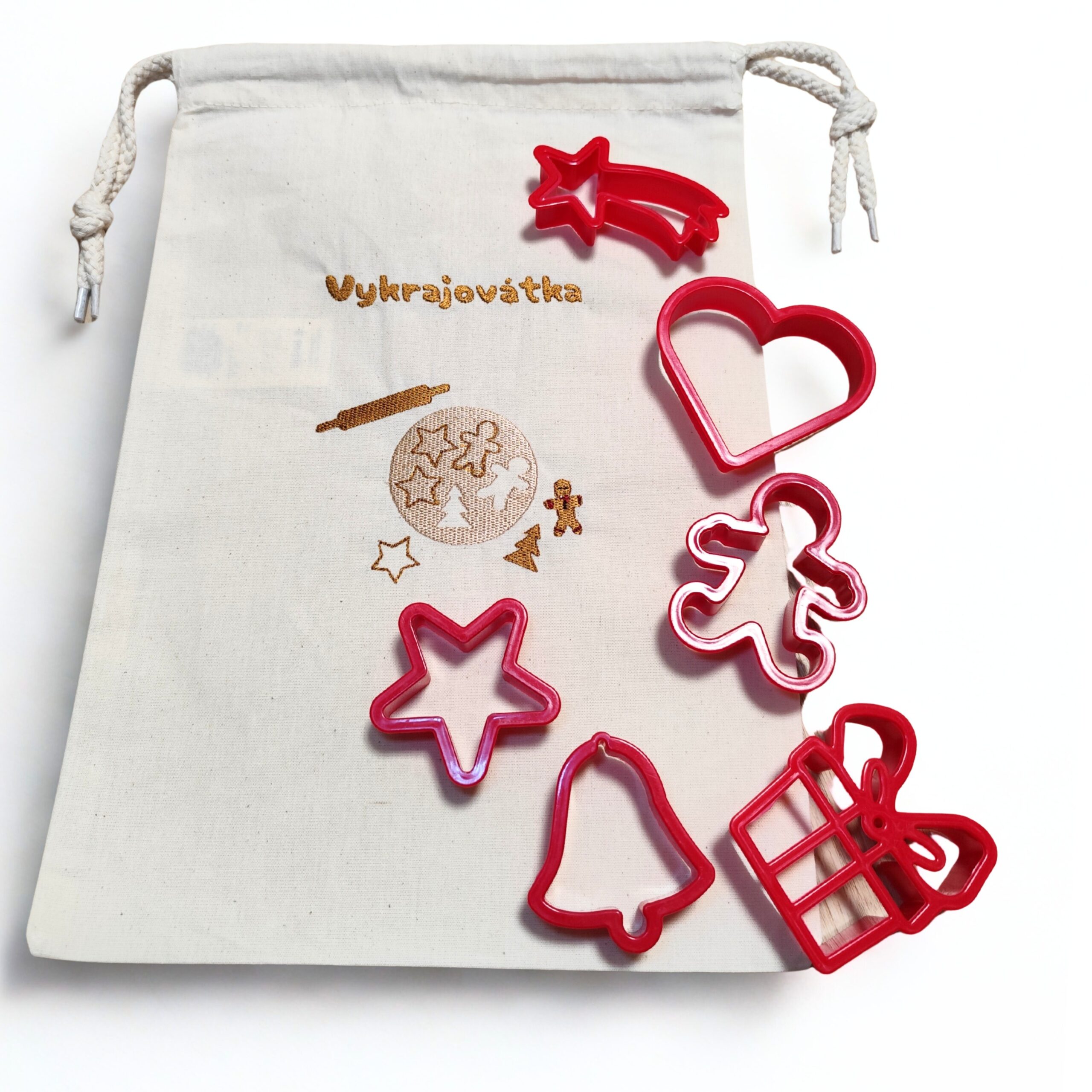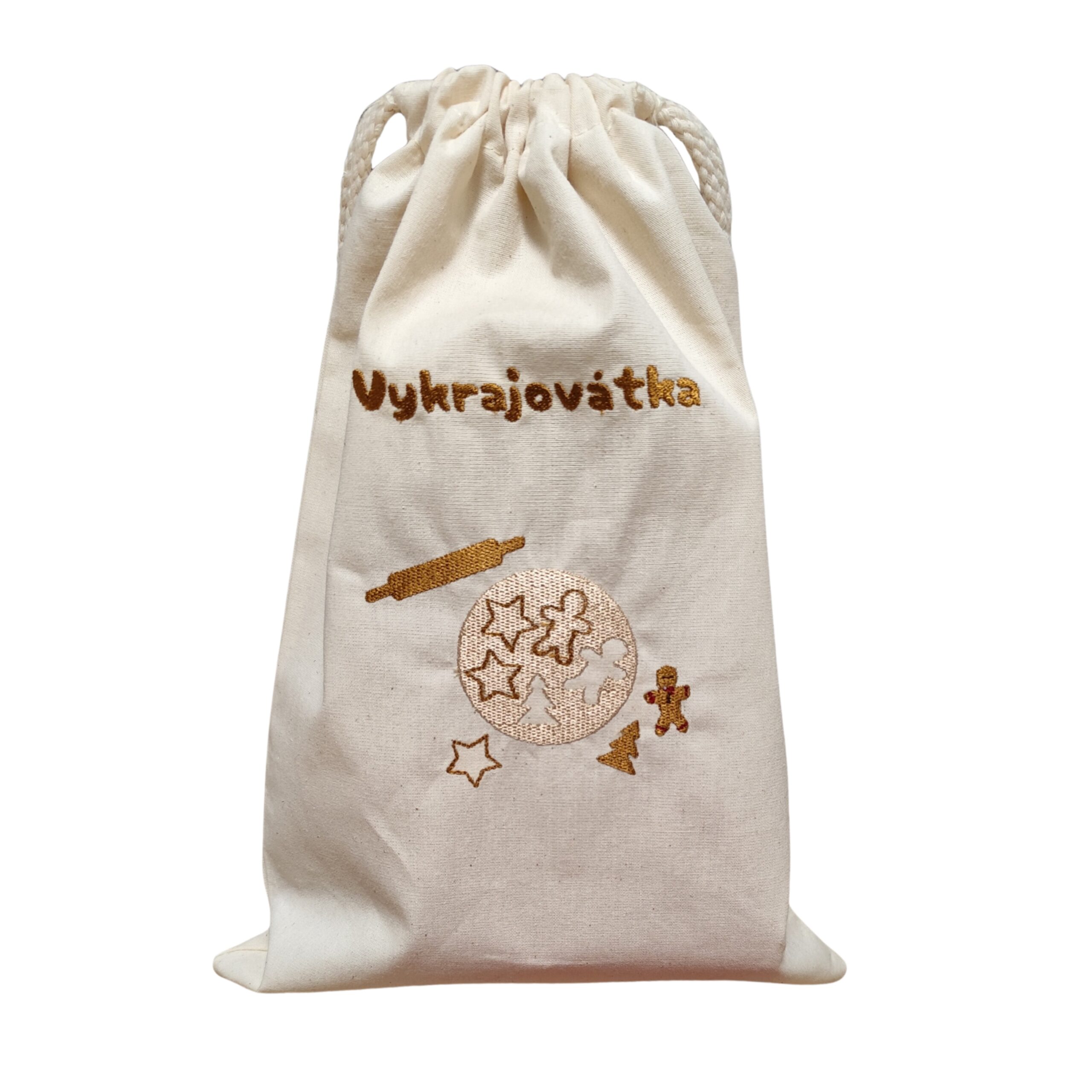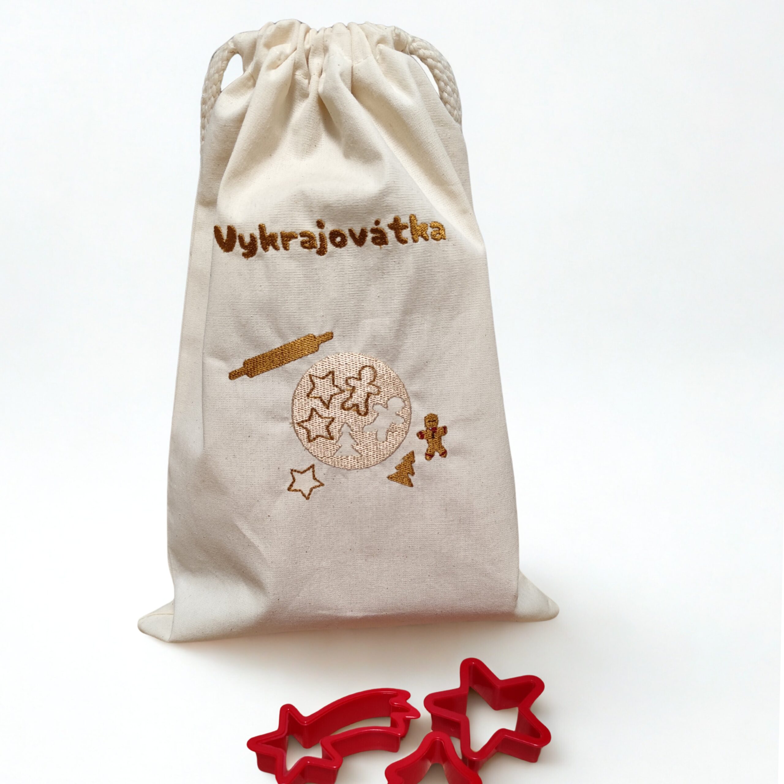 Bavlněný pytlík na vykrajovátka. Vhodný i jako krásný dárek. Můžu na něj vyšít jakýkoliv text – třeba Babiččiny vykrajovátka nebo vykrajovátka tety Aničky. (Text napište do poznámky v posledním kroku objednávky)