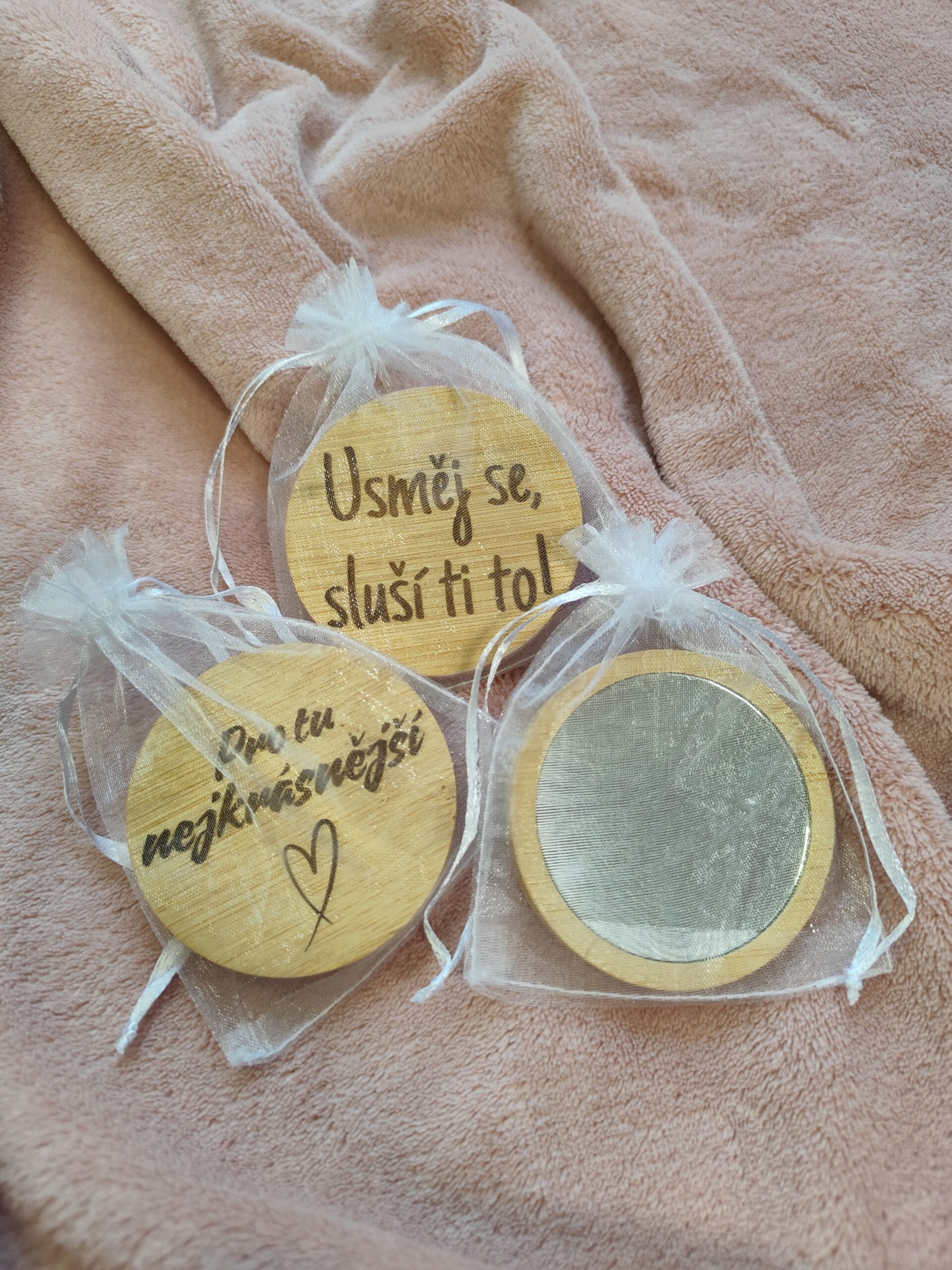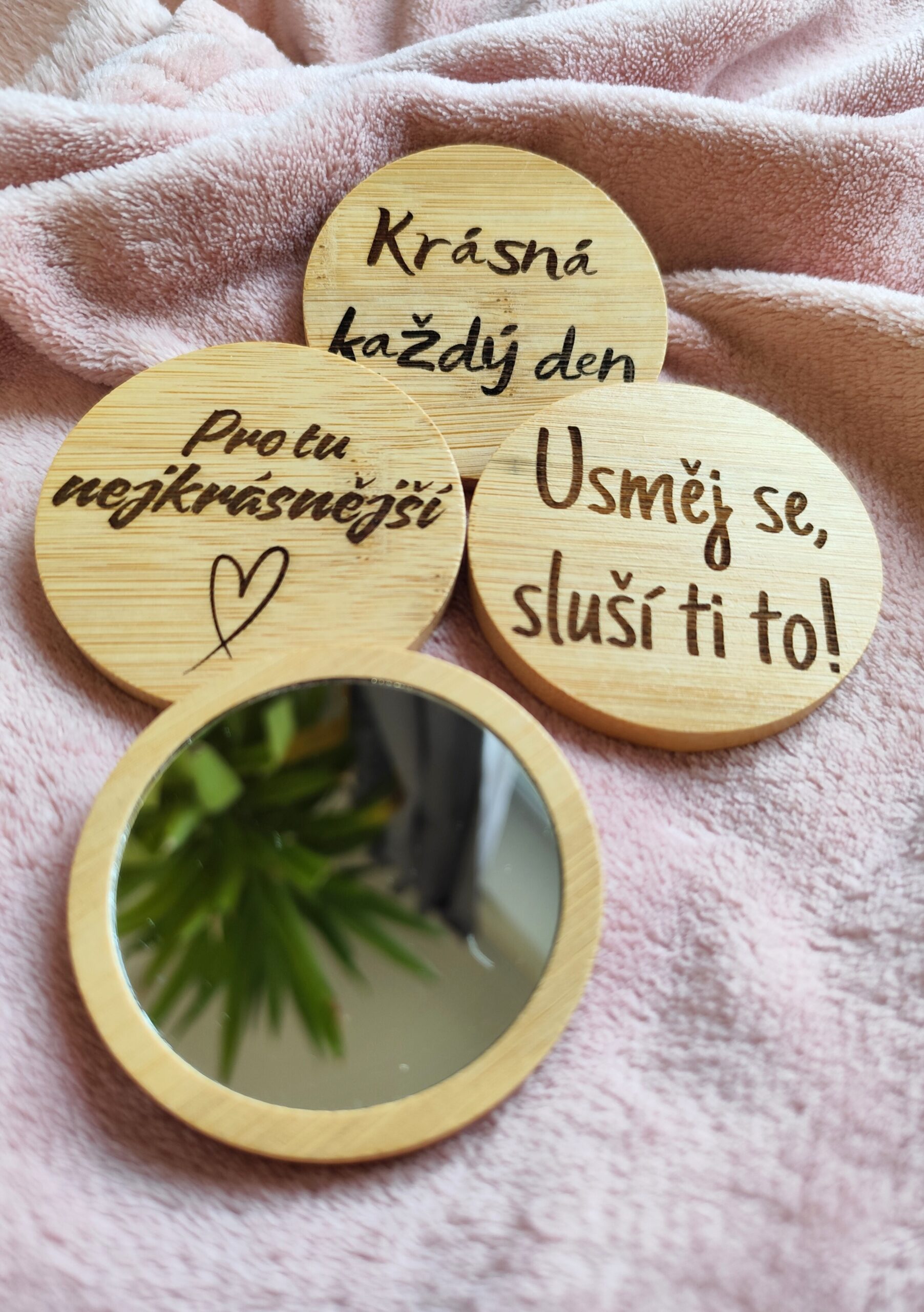 Gravírované kapesní zrcátko ze dřeva je krásná maličkost, která vykouzlí úsměv při každém použití.