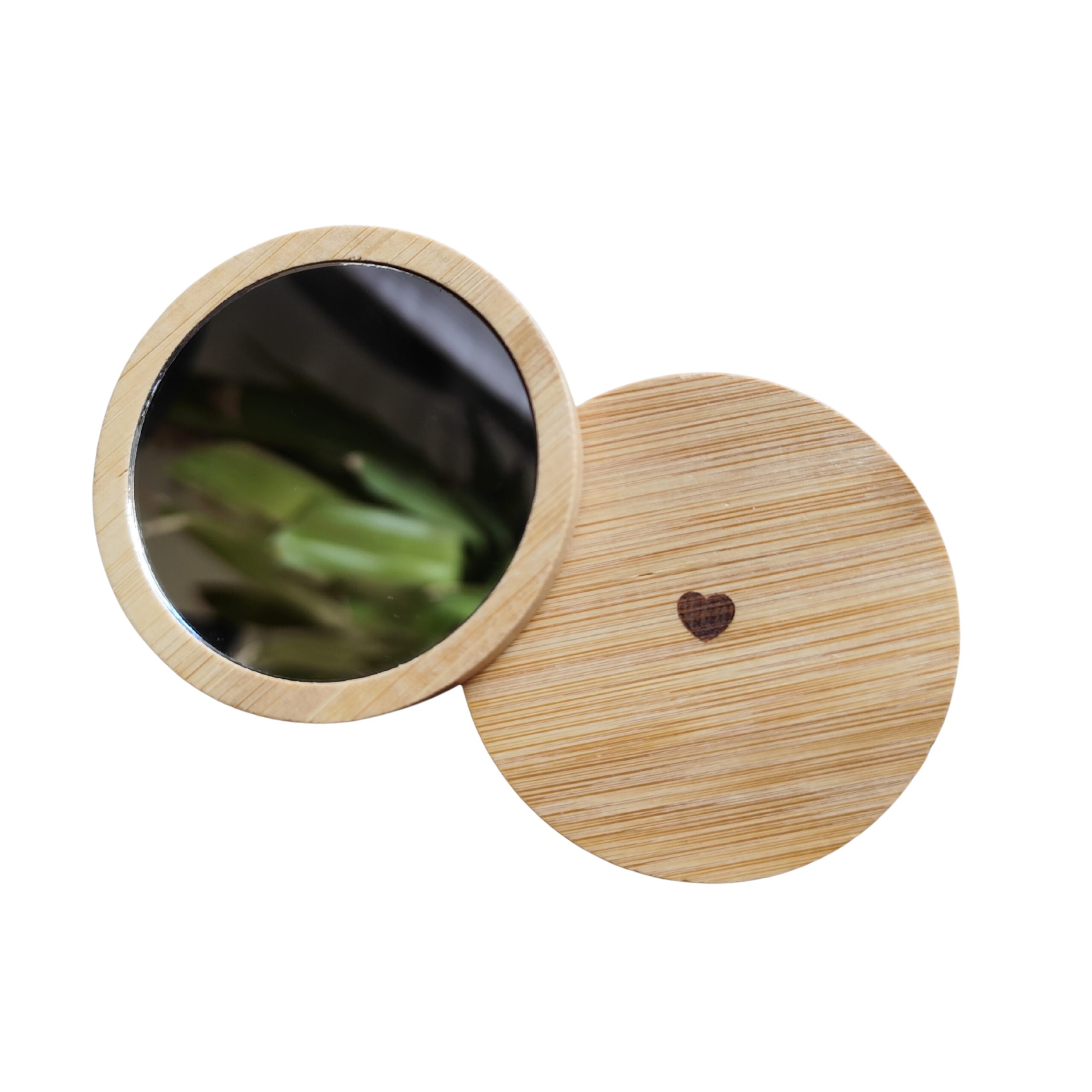 Gravírované dřevěné kapesní zrcátko s drobným srdíčkem je milá maličkost, která vykouzlí úsměv při každém použití.